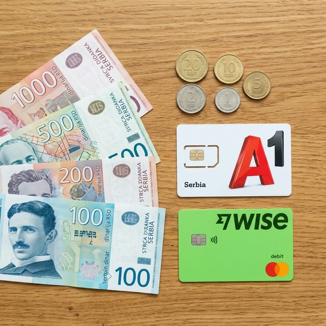 Wiseカードなら中間レート(為替手数料なし)でRSDに変換される。月2回・累計200EUR相当まではATM引き出し手数料も無料。3回目以降は1回あたり固定手数料がかかる。